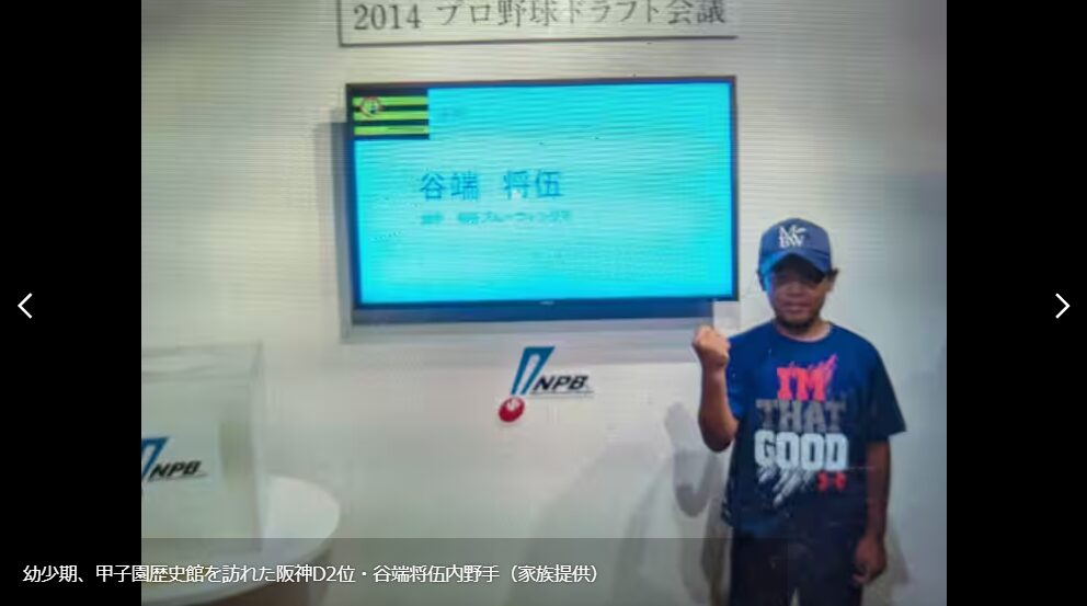 - 谷端選手は小学5年の時に甲子園歴史館で「ドラフト体験コーナー」で撮った写真をプロに入り実現していた!
