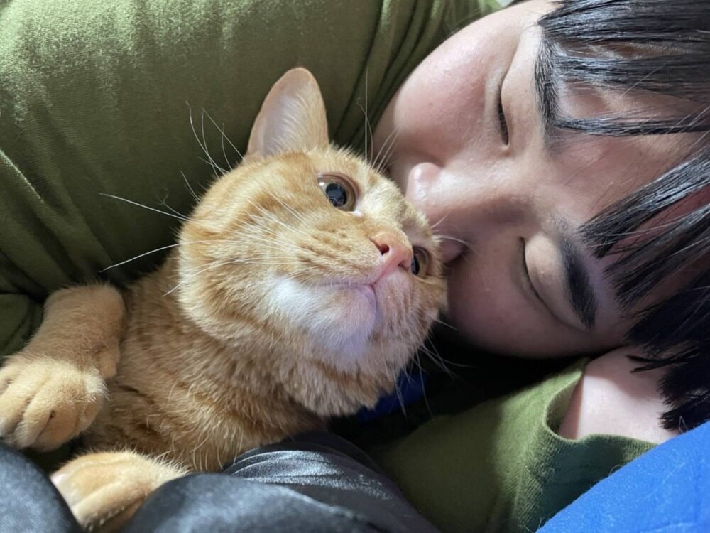 「かぼす」はとても甘えん坊で愛さんが自宅に帰ってくると床から胸に飛び乗り、愛さんが座るとずっと膝の上にのっているそうです。